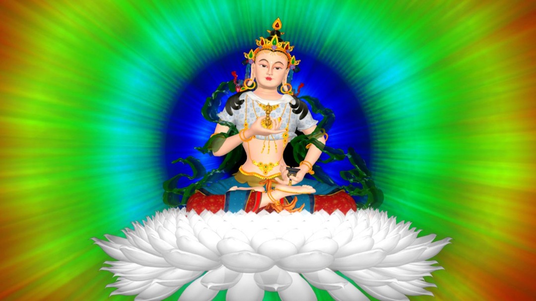 Next, sit in front of the thangka in the seven-point posture of Vairocana, fixing your eyes on the thangka without discursive thoughts, concentrating on the thangka—just let your mind and eye consciousness dissolve into the thangka. After some time, the image of Vajrasattva will gradually appear in your mind. You can then test if the image will also do so with your eyes closed. If the image disappears when you close your eyes, then just continue to observe the thangka. The teachings on the development stage practices describe various methods to remedy the problems that may arise during practice. For instance, a seated image in the thangka might end up being a standing image in your visualization, or the visualized image of the deity might be without a head, a hand, or some bodily ornaments, or the visualized image might be distorted. There are many methods to remedy this in the teachings. However, we don’t need to involve ourselves with elaborate visualizations at this stage. For now, we just need to engage in simple visualization.